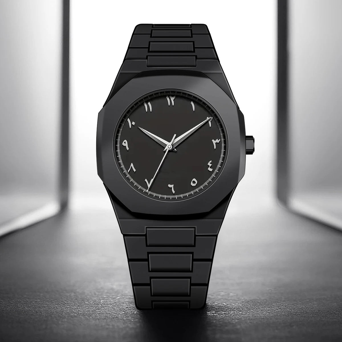 Black Aura Watch – Middle Eastern inspired sports quartz watch, waterproof stainless steel, stylish for men & women.